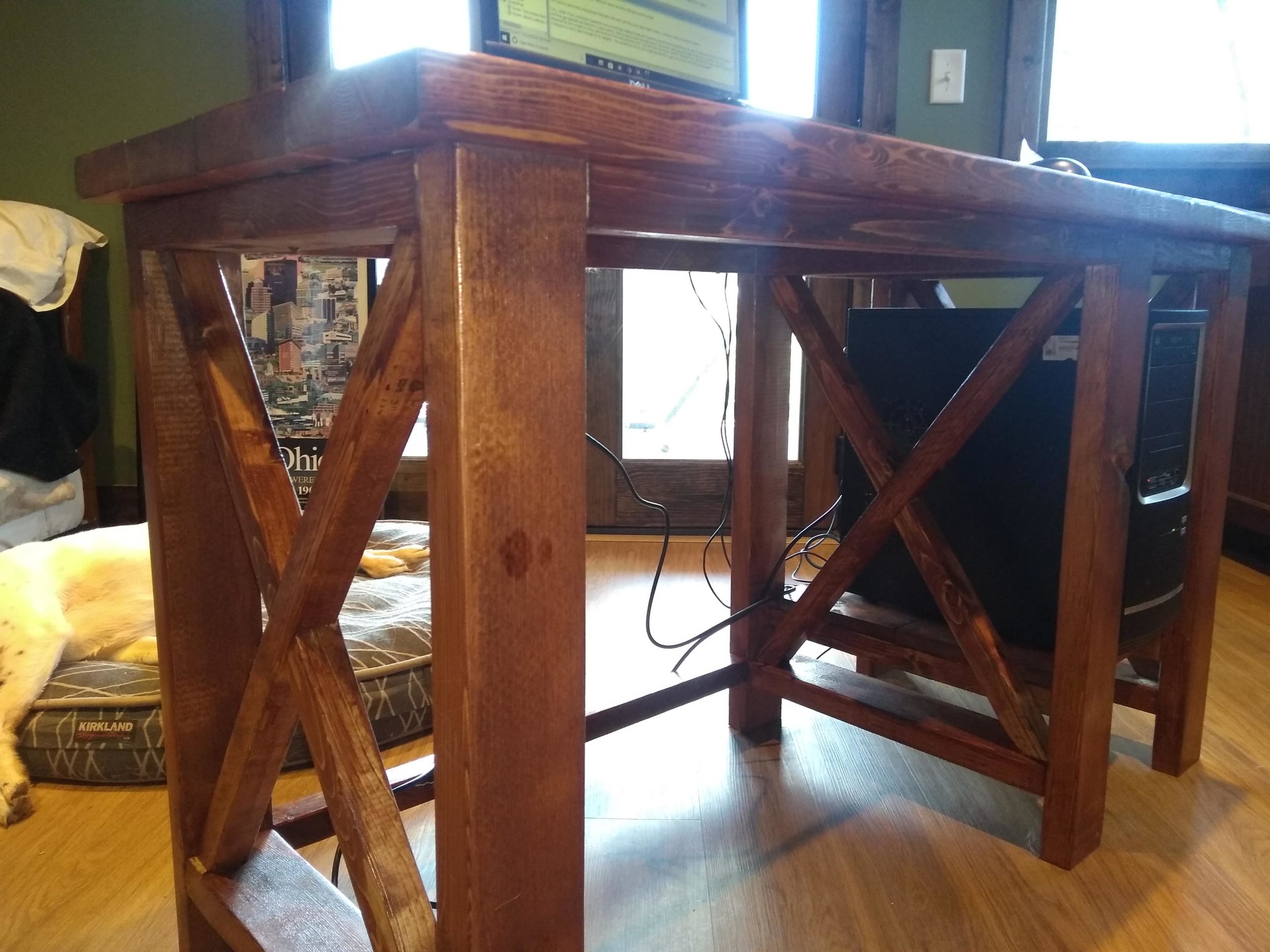 So I found this free desk plan online and my husband went to work. It’s an Ana White Rustic X-desk, and I love the look. We set it up in my office behind my main desk, so all I have to do is turn around. And I’m back to writing!